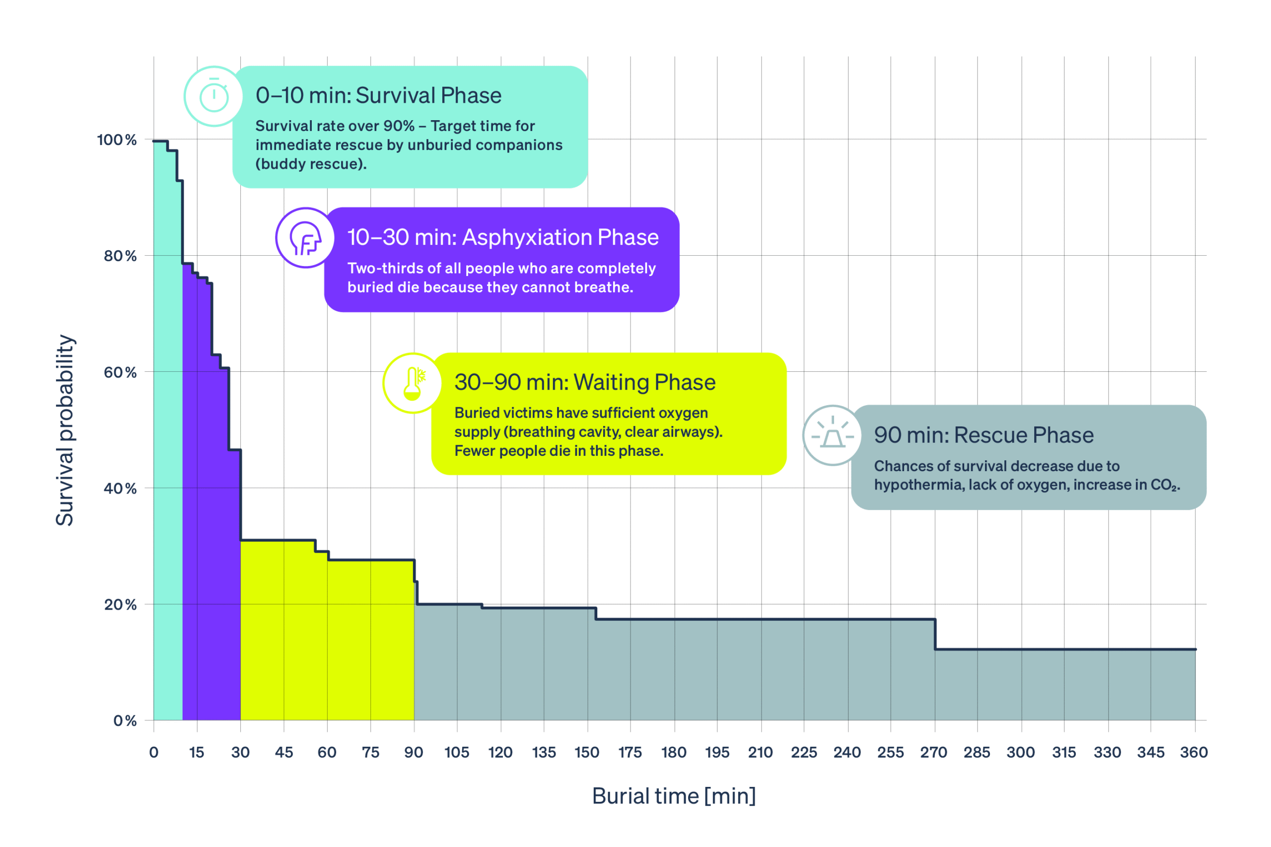 The typical skier avalanche is around 50-70 meters wide and has about three times the flow length. The fracture depth (also known as the break-off height ) is around half a meter on average. Most people die in avalanches as a result of suffocation (approx. 57%) or fatal injuries (30%). As a general rule, the chances of survival decrease with increasing burial time.